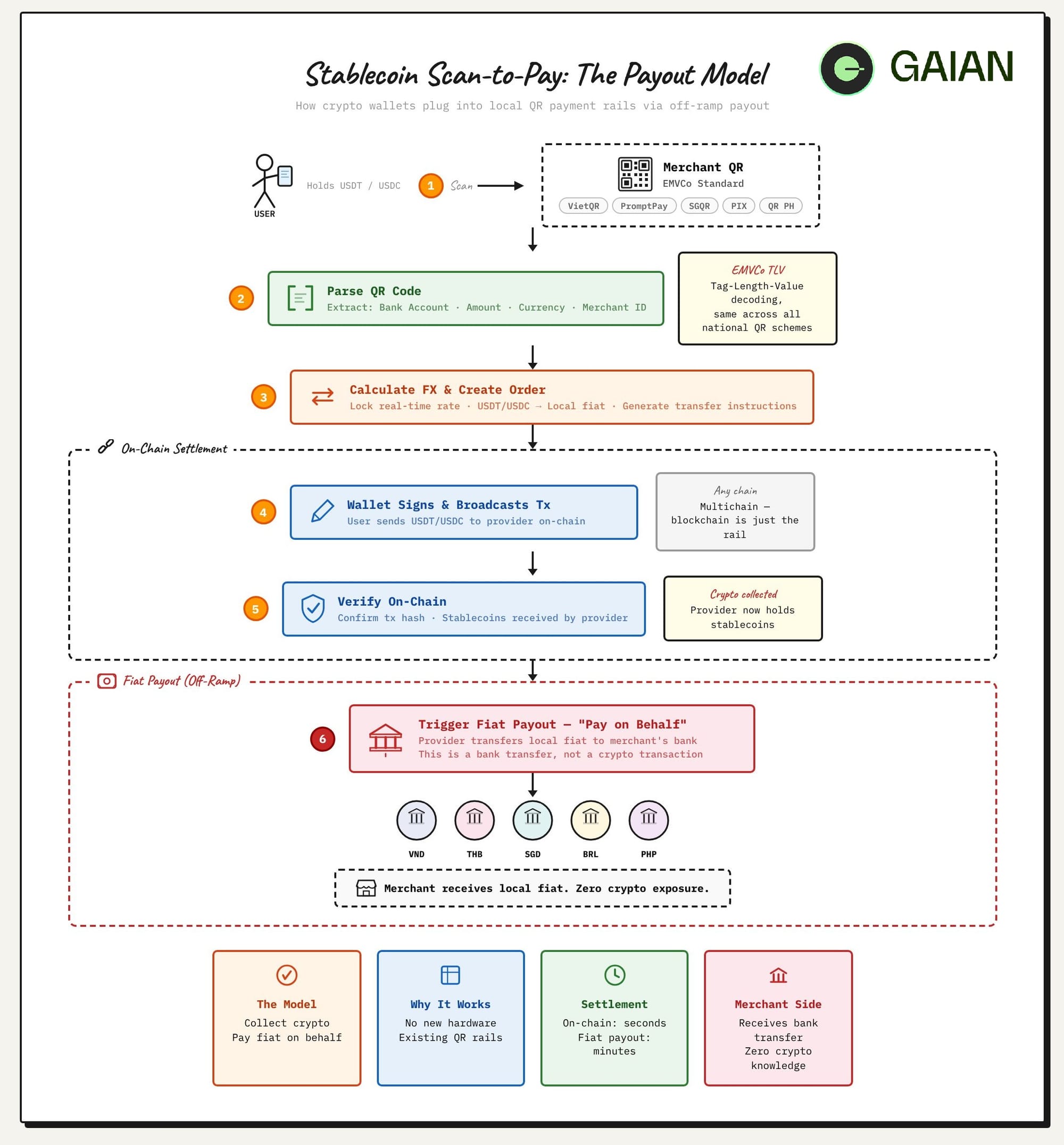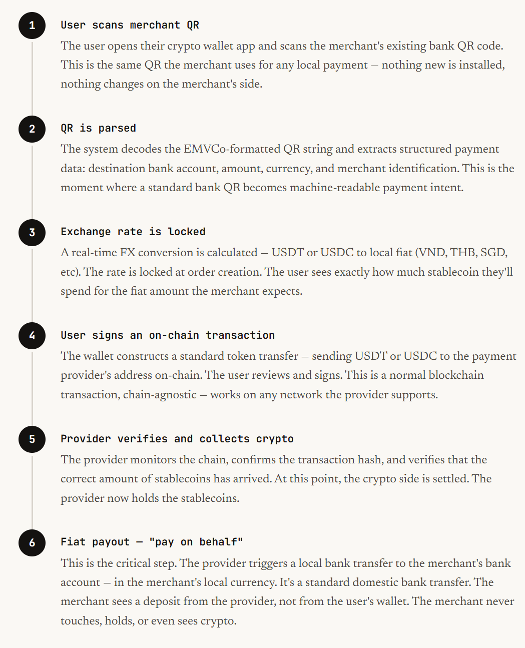 So when a user scans that QR with a crypto wallet and the merchant receives Vietnamese dong in their bank account three minutes later — what actually happened?