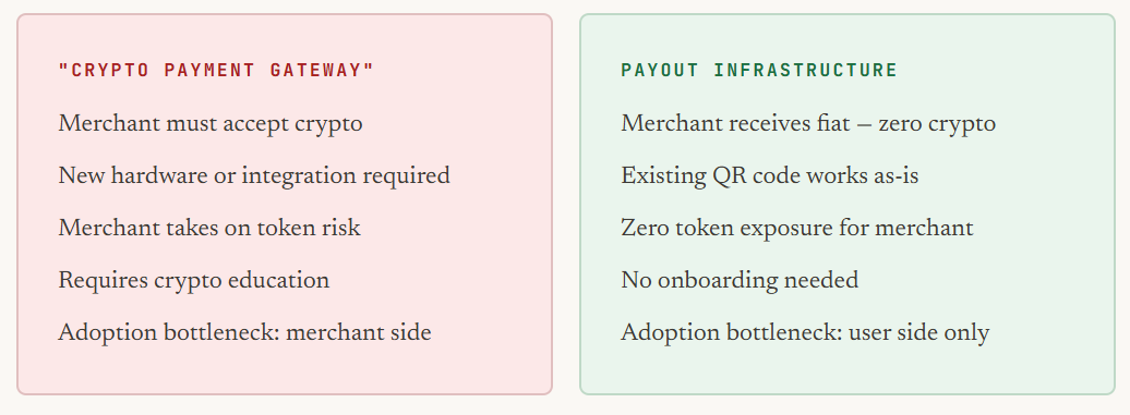 If you think you're building a "crypto payment gateway," you're trying to get merchants to accept crypto. That means merchant onboarding, new terminals, new settlement flows, compliance education — all the friction that has stalled crypto payments for a decade.