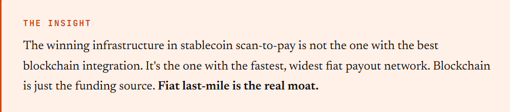 This is the same structural insight that made Wise (formerly TransferWise) work. They didn't try to convince banks to change how they process transfers. They built a payout layer on top of existing bank rails. Stablecoin scan-to-pay follows the exact same playbook — but with crypto as the funding source instead of a foreign bank account.