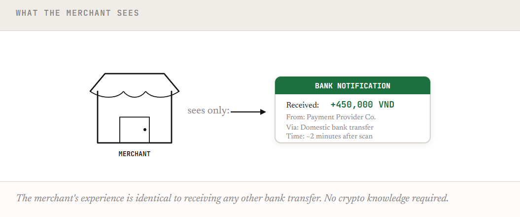 A customer walks in, scans the QR code with a crypto wallet, and two minutes later the merchant gets a push notification from Vietcombank: +450,000 VND received. From a domestic bank transfer. That's all they see.