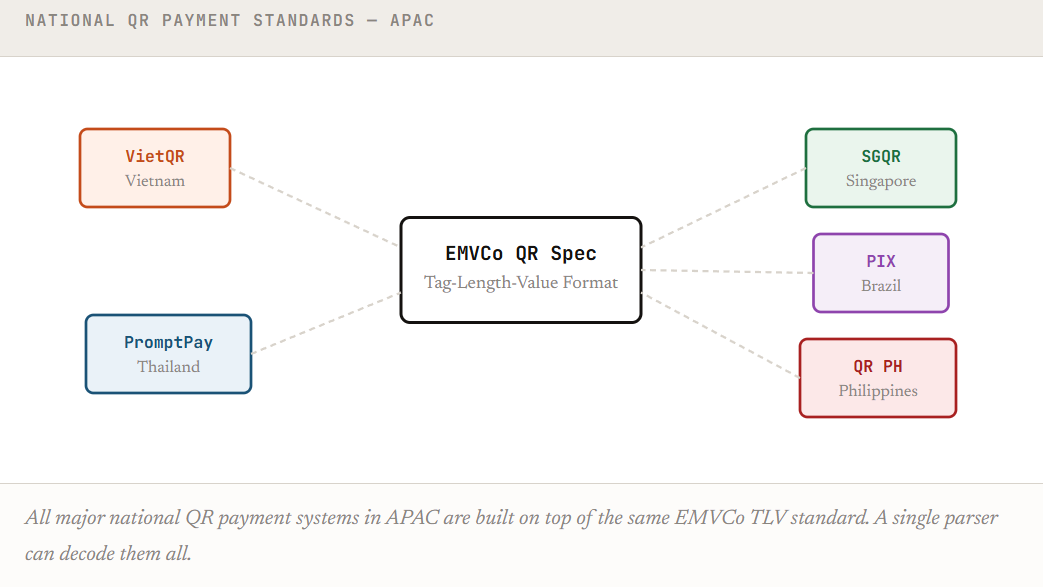 This means a single QR parser, built once, can decode merchant payment data across Vietnam, Thailand, Singapore, Brazil, the Philippines, and any other market that follows the EMVCo standard.